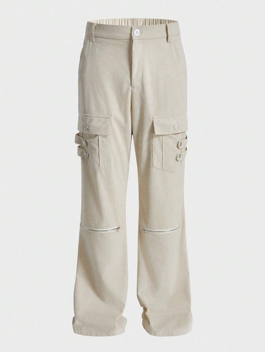 Street Life Men's Solid Color Cargo Pants With Zipper Pockets, Casual Flare Pants Trousers