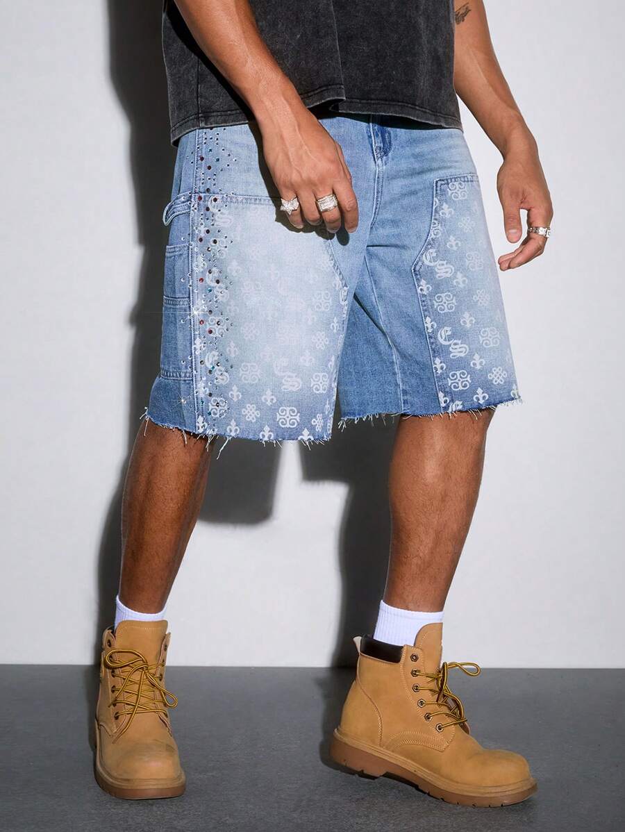 Street Life Men's Sparkle Diamond Floral Cross Print Frayed Hem Loose Denim Shorts