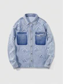 Street Life Men's Star Embroidery Casual Denim Jacket, Minimalist & Fashionable, Suitable For Everyday Wear
