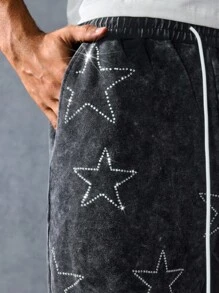 Street Life Men's Star Rhinestone Drawstring Waist Pocket Loose Washed Shorts