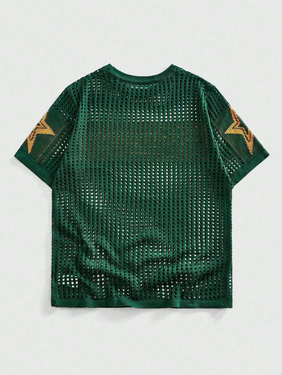 Street Life Men's Summer Fashionable Street Casual Letter & Star Pattern Jacquard Hollow-Out Semi-Sheer Top