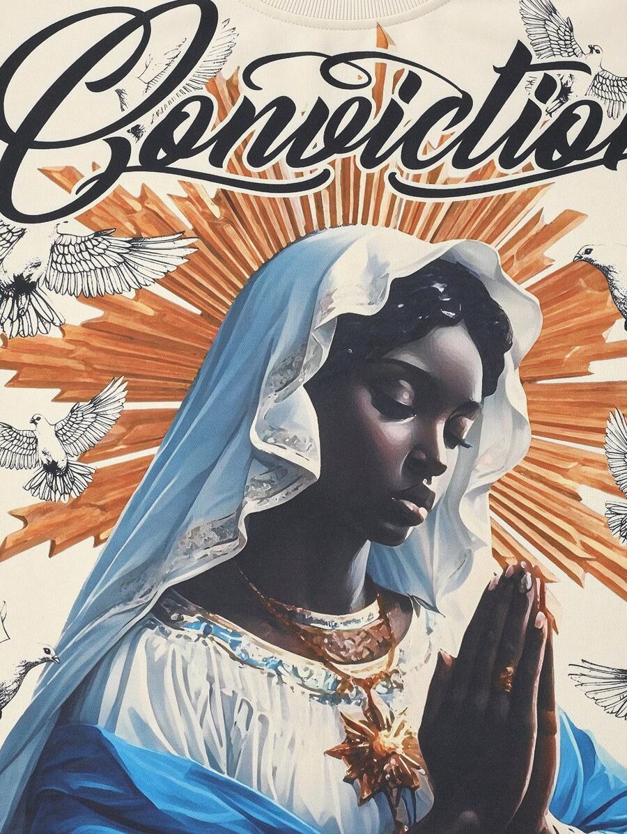 Street Life Men's Vintage Loose Short Version Letter Virgin Mary Printed Round Neck Short Sleeve T-Shirt