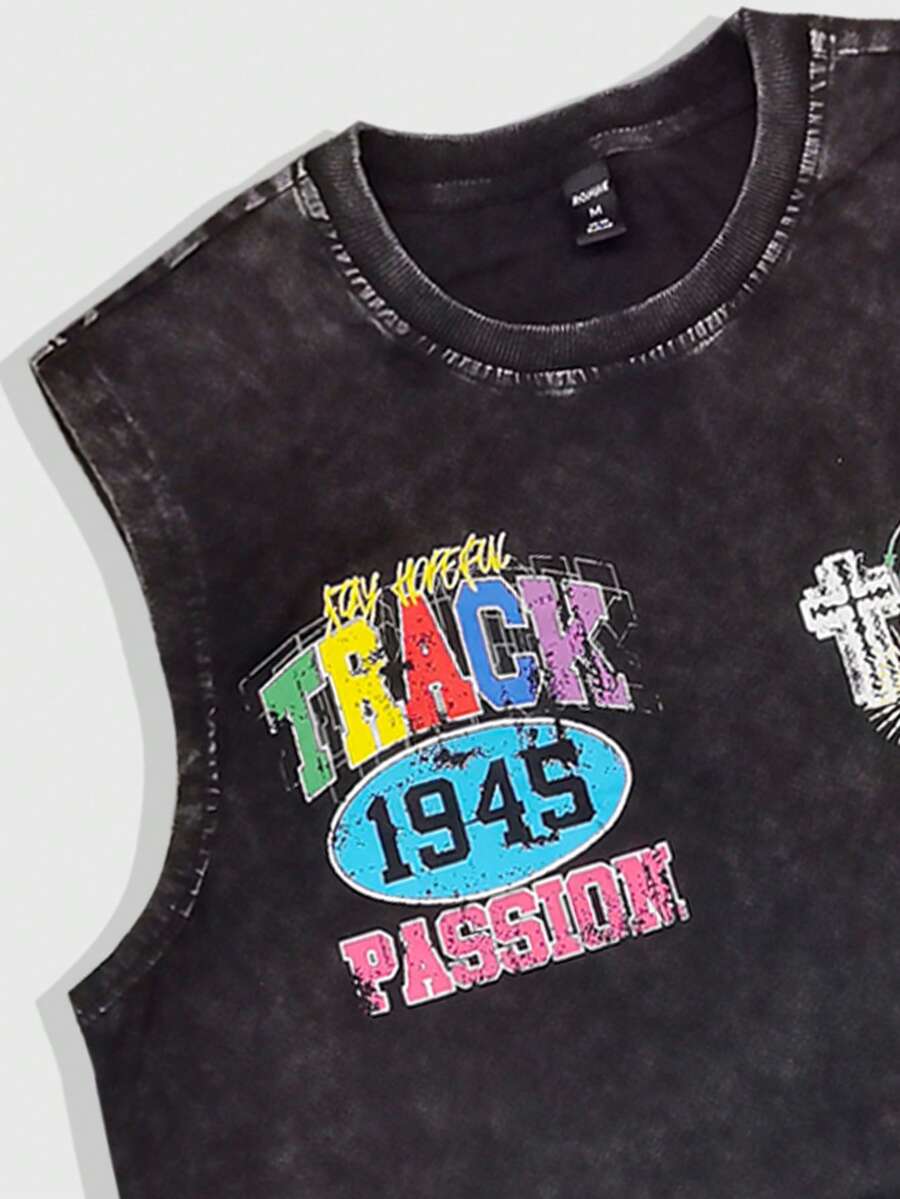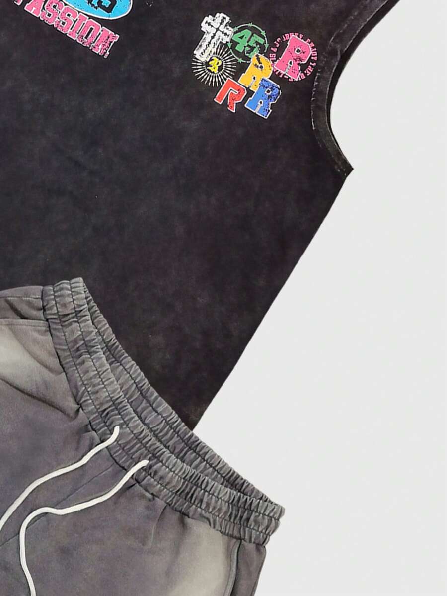 Street Life Men's Washed Casual Letter Print Tank Top And Shorts Set, Summer