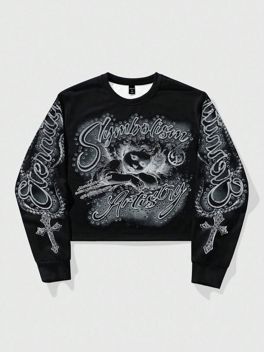 Street Life Teen Boy Letter & Portrait Graphic Crew Neck Long Sleeve Pullover Sweatshirt