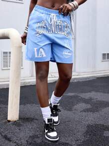 Street Life Women's Letter Print Drawstring Waist Pocket Casual Loose Shorts