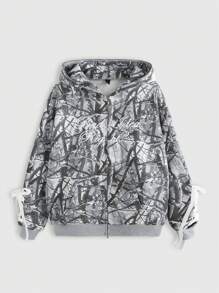 Street Life Y2K Streetwear Camouflage Print & White Ribbon Loose Sweatshirt Sweatshirt, Plus Size
