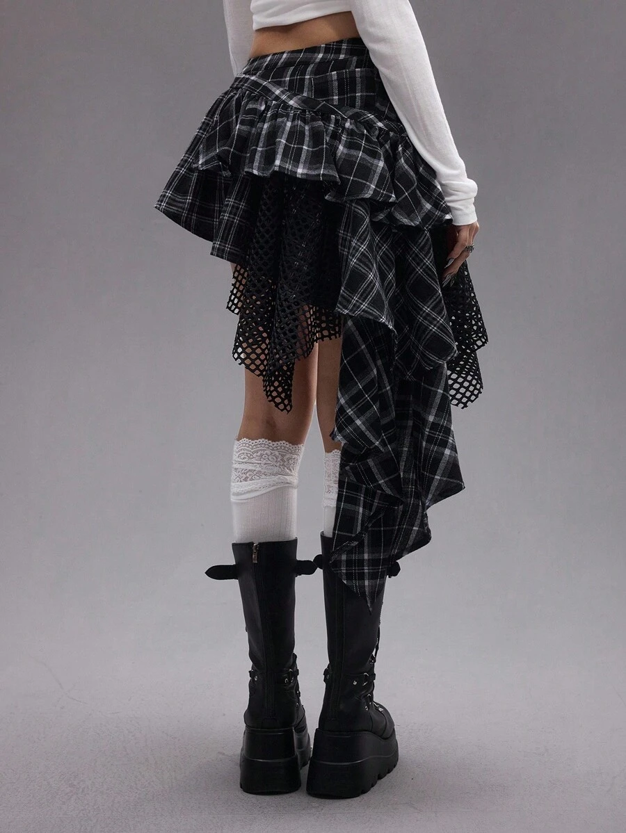 Grunge Punk Summer Beach Graduation Easter Skirt Women Concert Nashville Festival Rock Rivet Rhinestone Strap Sleeveless Plaid Vintage Y2K Patchwork Red Blue Lace Mesh Streetwear Asymmetric Hem Low Waist Women Skirt