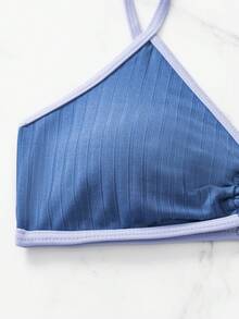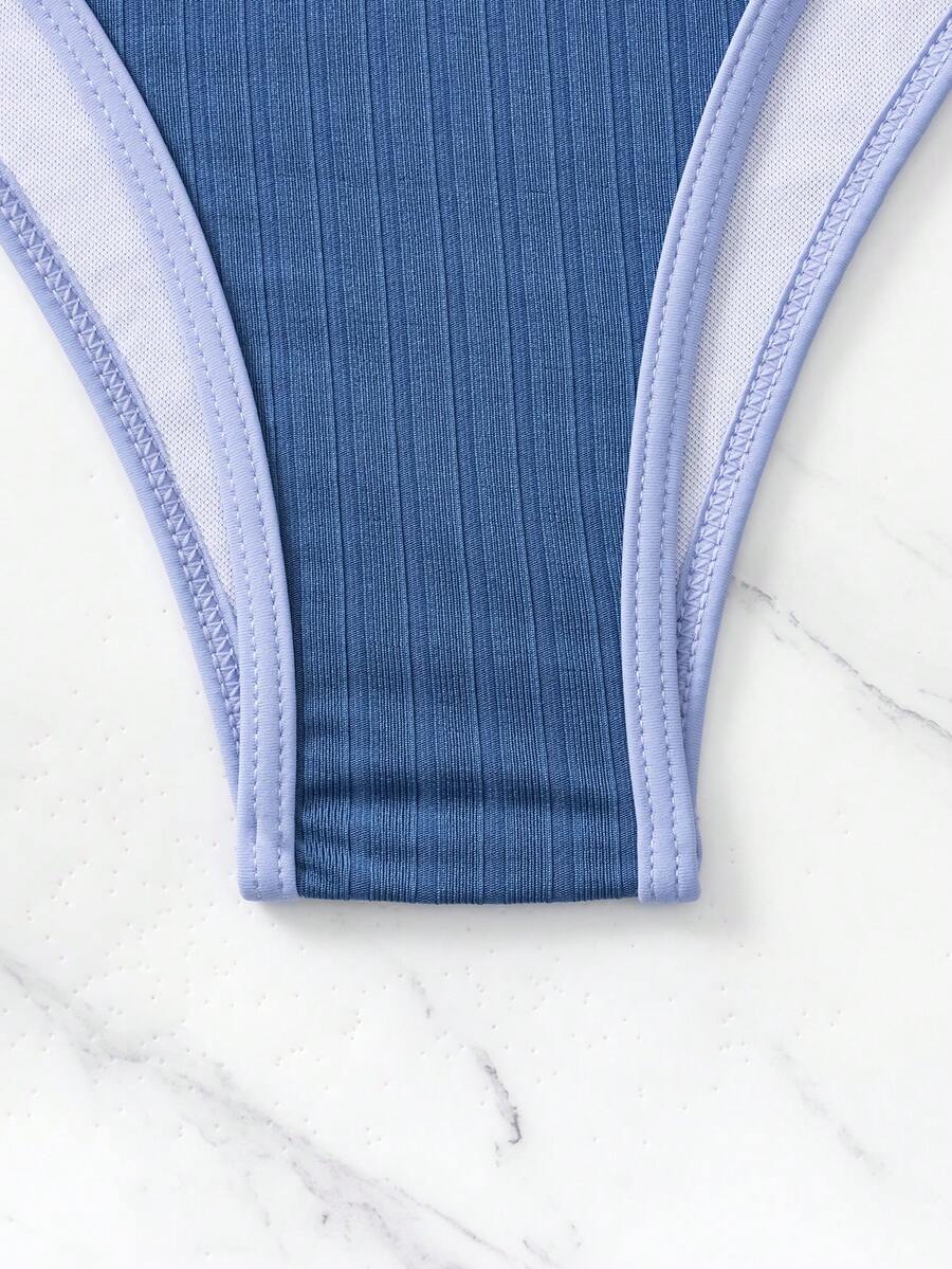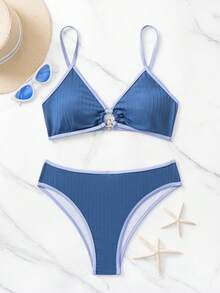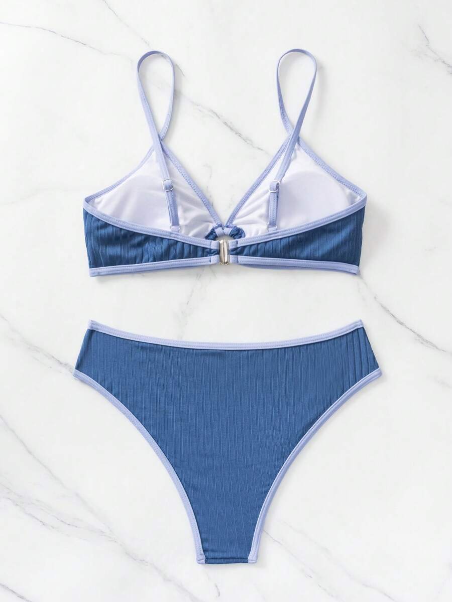 Summer Beach Ribbed Bikini Set Contrast Binding Ring Linked Bra & Bikini Bottom 2 Piece Bathing Suit