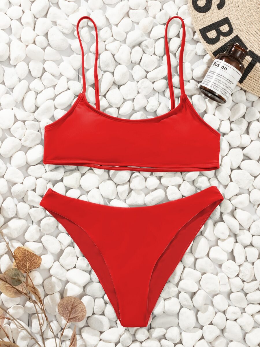 Summer Beach Solid Bikini Set Cut-Out Back Bra & High Cut Bottom 2 Pieces Bikini