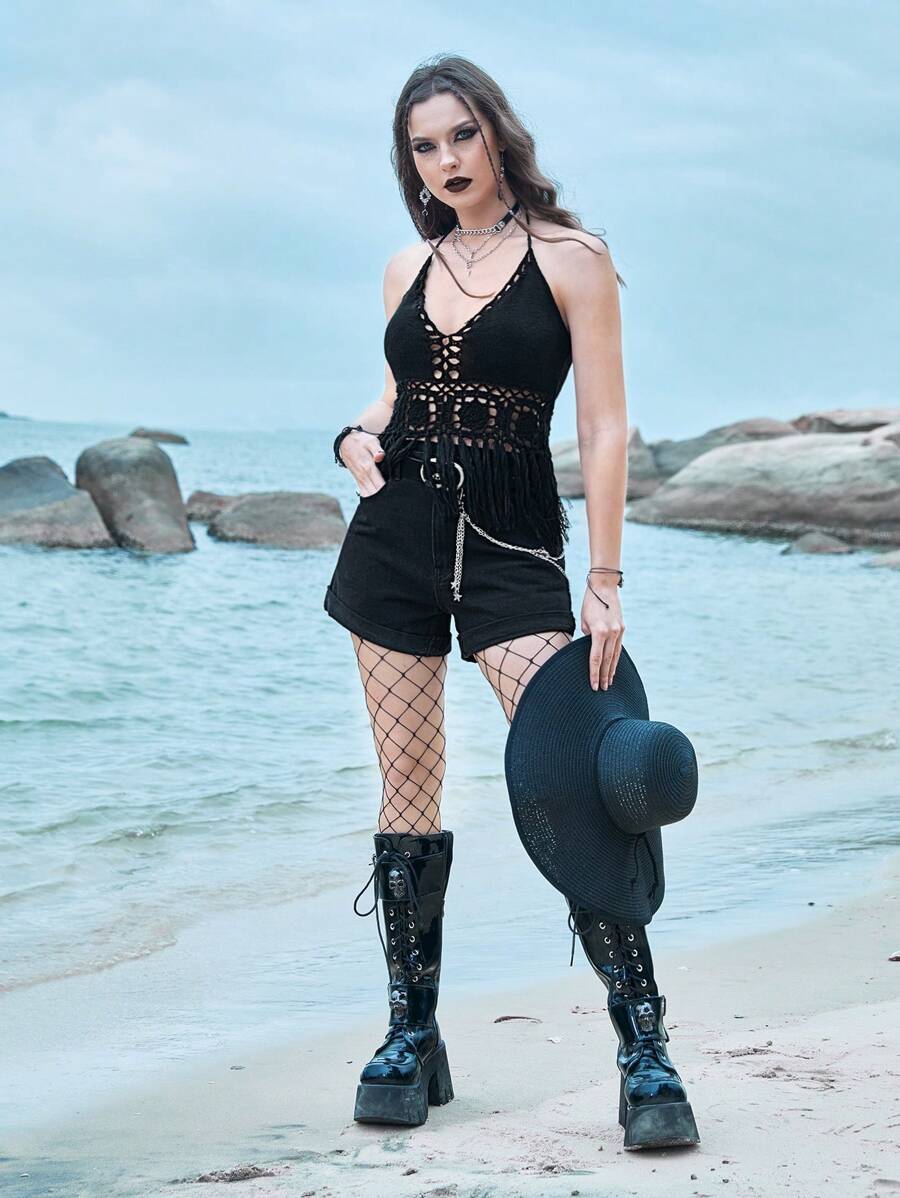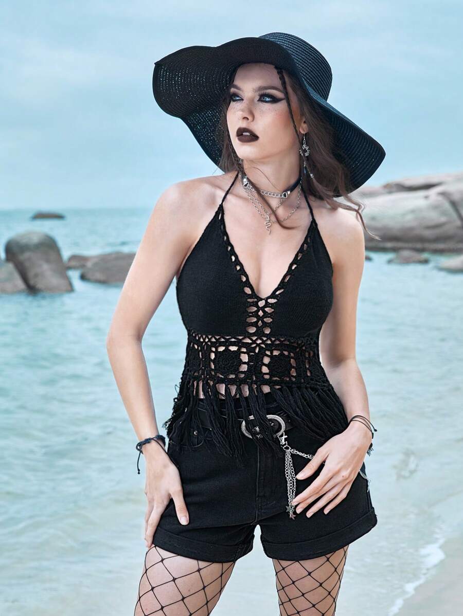 Summer Crochet Beach Holiday Hollow Out Fringe Hem Tie Backless Halter Knit Top