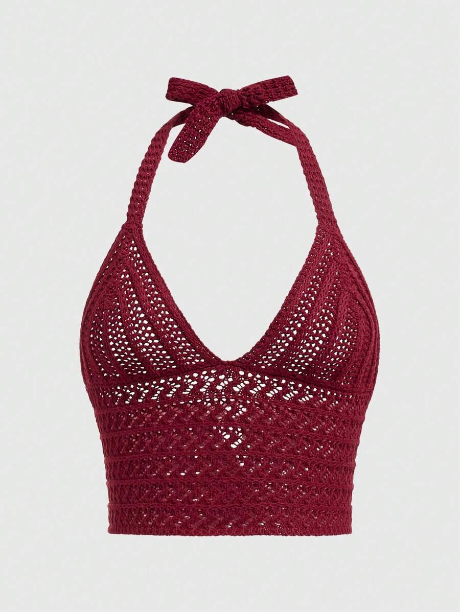 Summer Crochet Beach Holiday Solid Knit Lace Up Halter Top