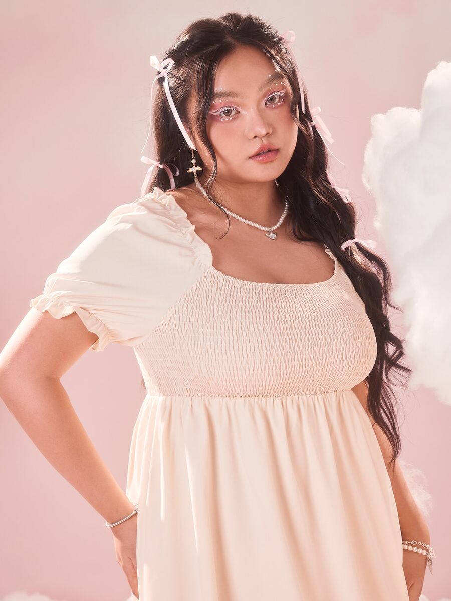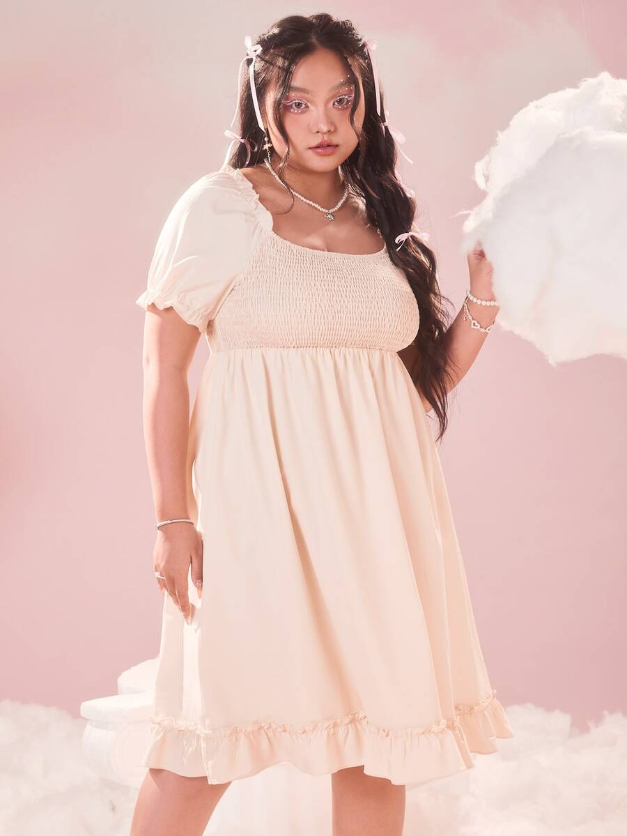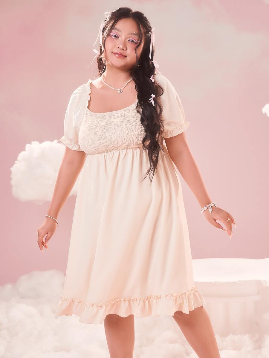 Sweetness Plus Shirred Puff Sleeve Ruffle Hem Dress
