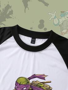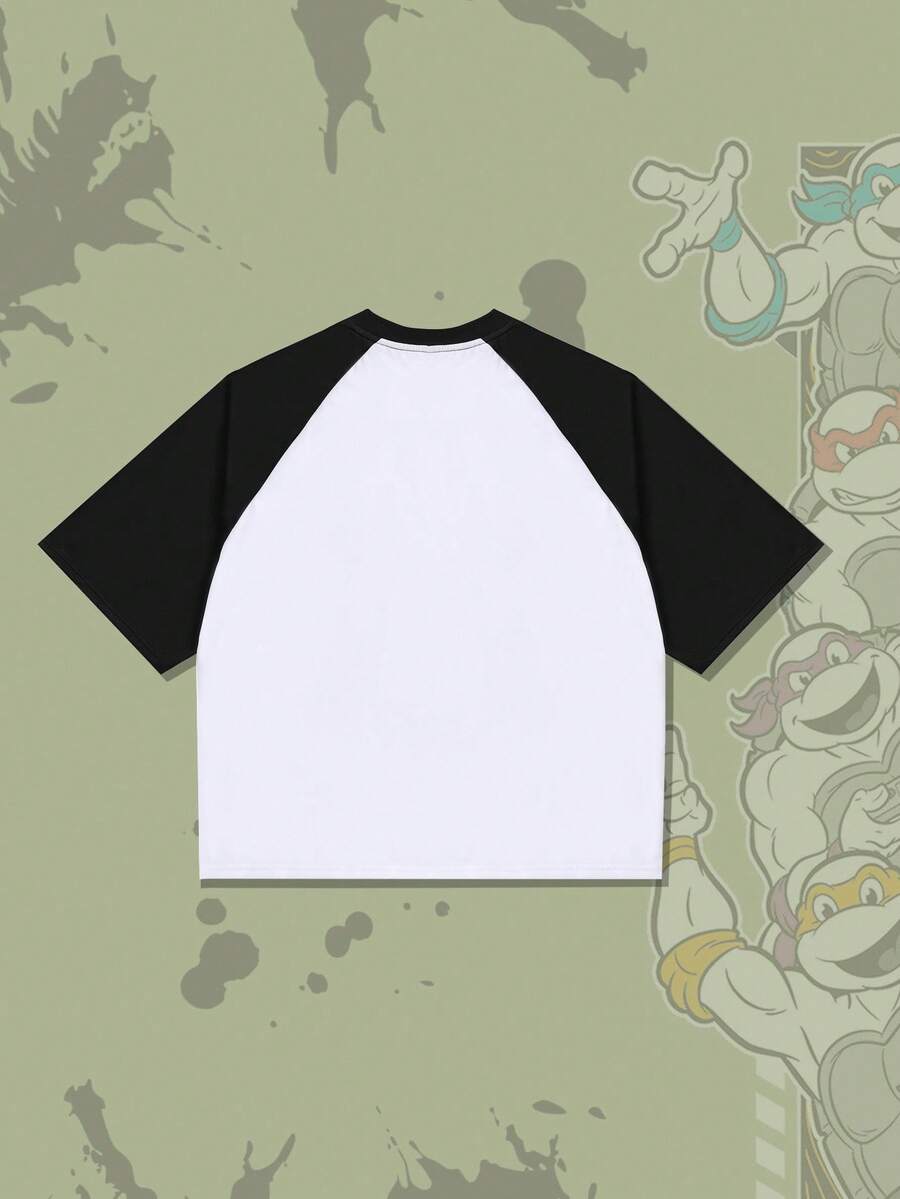 TEENAGE MUTANT NINJA TURTLES X ROMWE Men's Fashionable Street Cartoon Turtle & Slogan Graphic Contrast Raglan Sleeve Loose T-Shirt, Summer