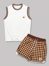 Street Life Teen Boy Contrast Trim Round Neck Tank Top And Diamond Print Drawstring Waist Shorts Casual Outfit