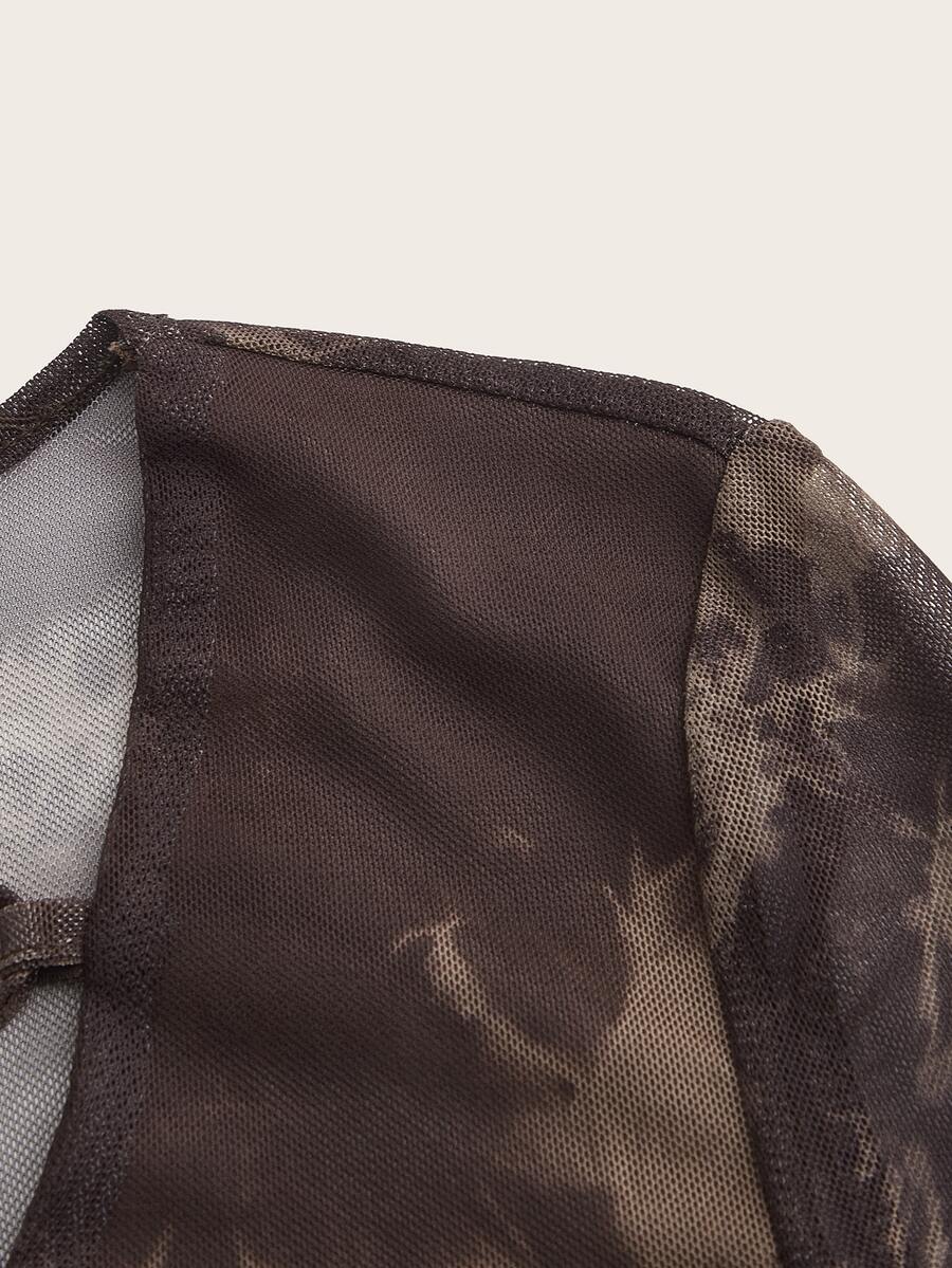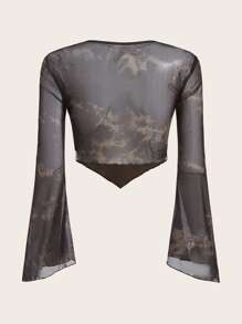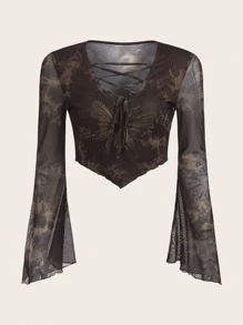 Tie Dye Butterfly Print Lace Up Flounce Sleeve Top