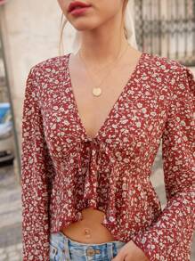Tie Front Ditsy Floral Ruffle Hem Top Christmas Winter Vacation Flower