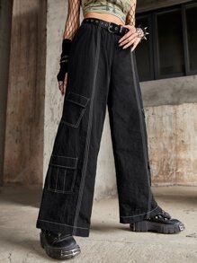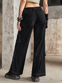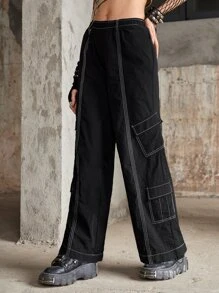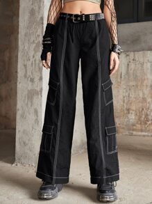 Top-stitching Flap Pocket Side Cargo Pants Without Belt