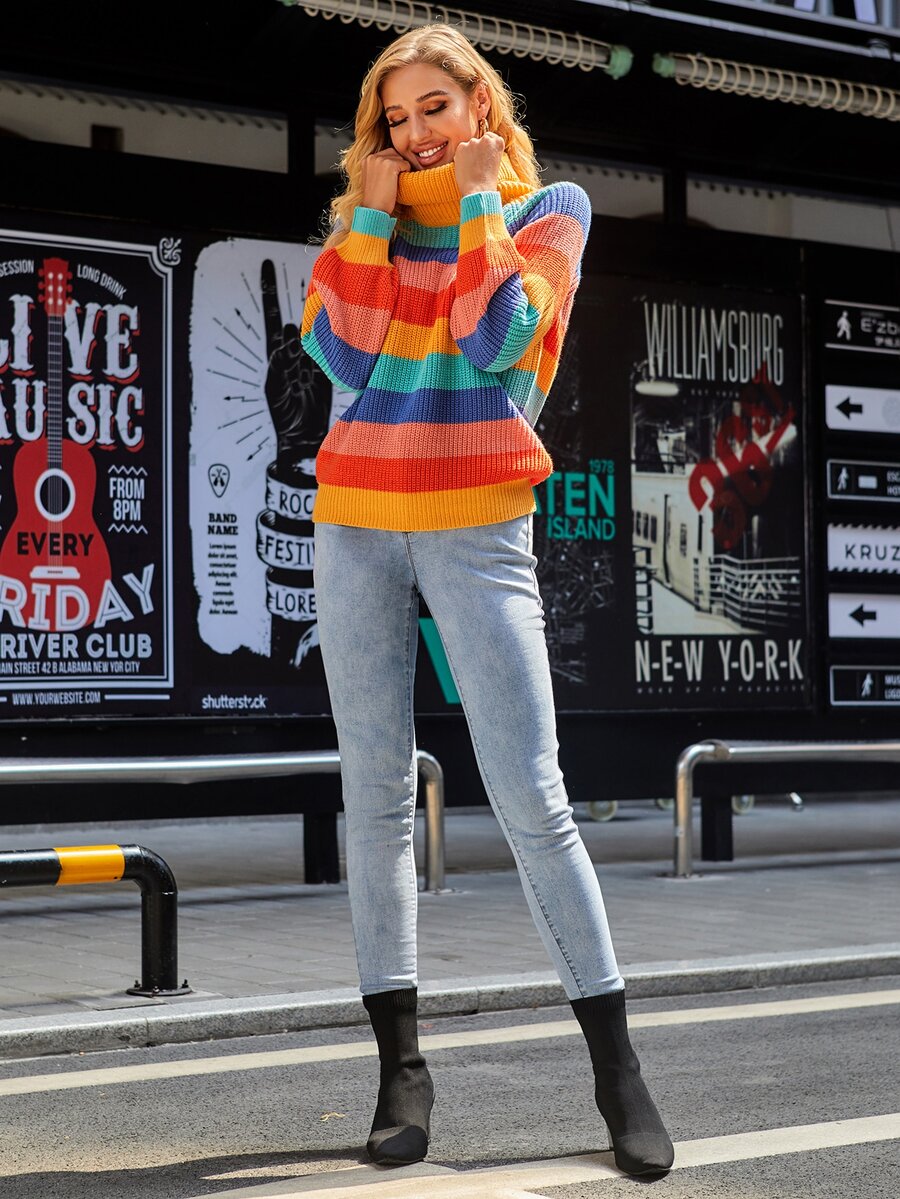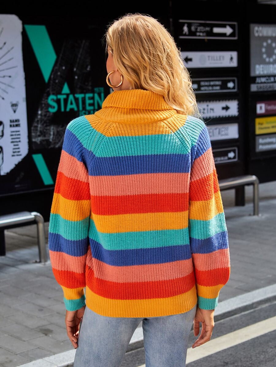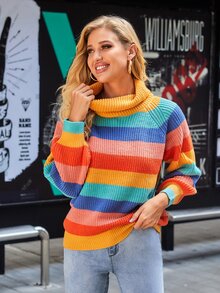 Turtleneck Raglan Sleeve Rainbow Stripe Sweater