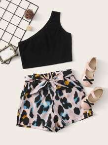 Tween Girl One Shoulder Top & Belted Allover Print Shorts Set