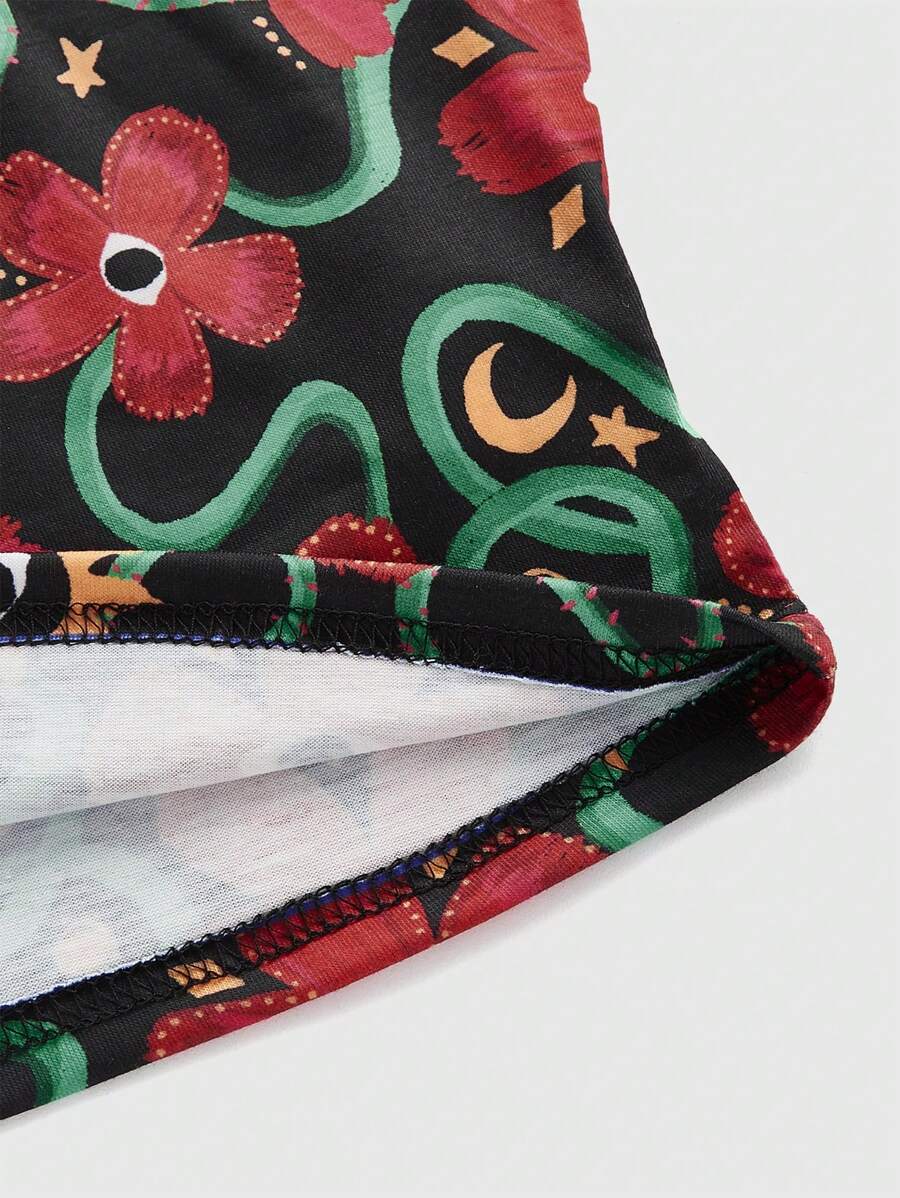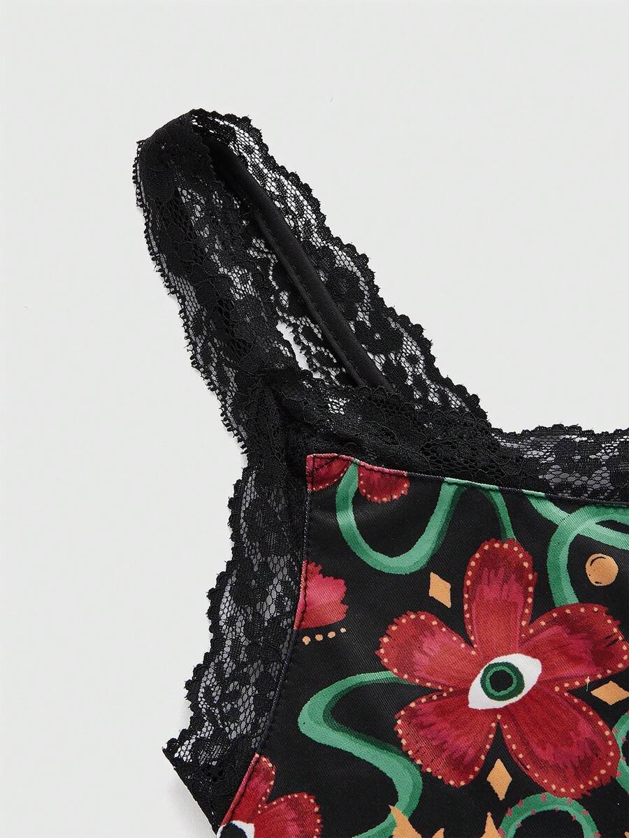 Umamao Estudio Flower & Eye Pattern Printed Lace Splicing Cami Top