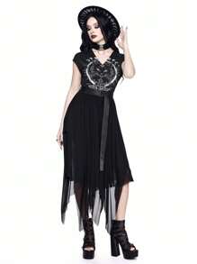 V-Neck Front Print, Black Punk Style Midi Dress For Women With Belted Waist And Asymmetrical Mesh Hem Gothic Dress,Summer,Summerouis ,Summer Cothes,Summer Outfits For Women