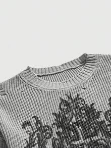 Grunge Punk Vintage Dark Print Distressed Sweater For Women, Autumn, Oversized Loose Knit Design