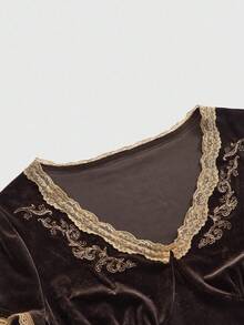 Goth Vintage Palace Flower Vine Embroidery Lace Spliced V-Neck Slim Fit Women's T-Shirt