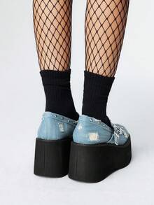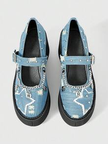 Grunge Punk Vintage Thick Sole Round Toe Buckle Strap Casual Shoes Fashion Blue Star Metal Chain Decor Gothic Style Low Vamp High Heel Party Dress Shoes For Women