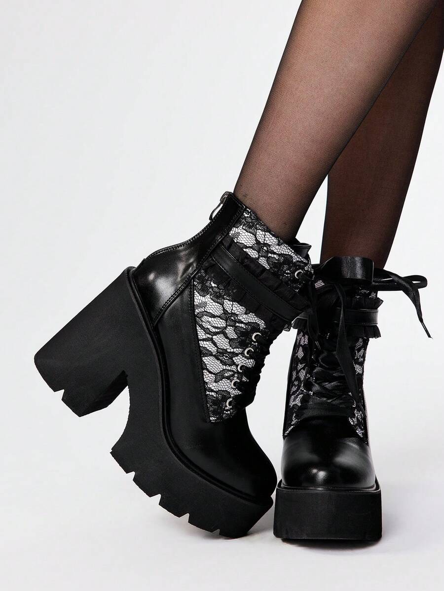 Grunge Punk Vintage White Lace Chunky Heel Ankle Boots Sexy Black Embroidered High Platform Goth Punk Style Buckle Ankle Boots