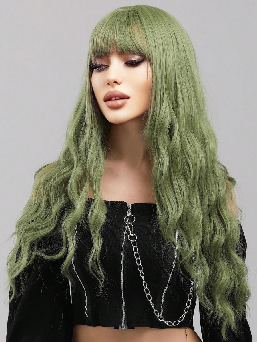 Water Wave Wigs With Bangs Green Color 28 Inch Heat Resistant Fiber Long Wavy Deep Wave Synthetic Wigs For Women Party Daily Used