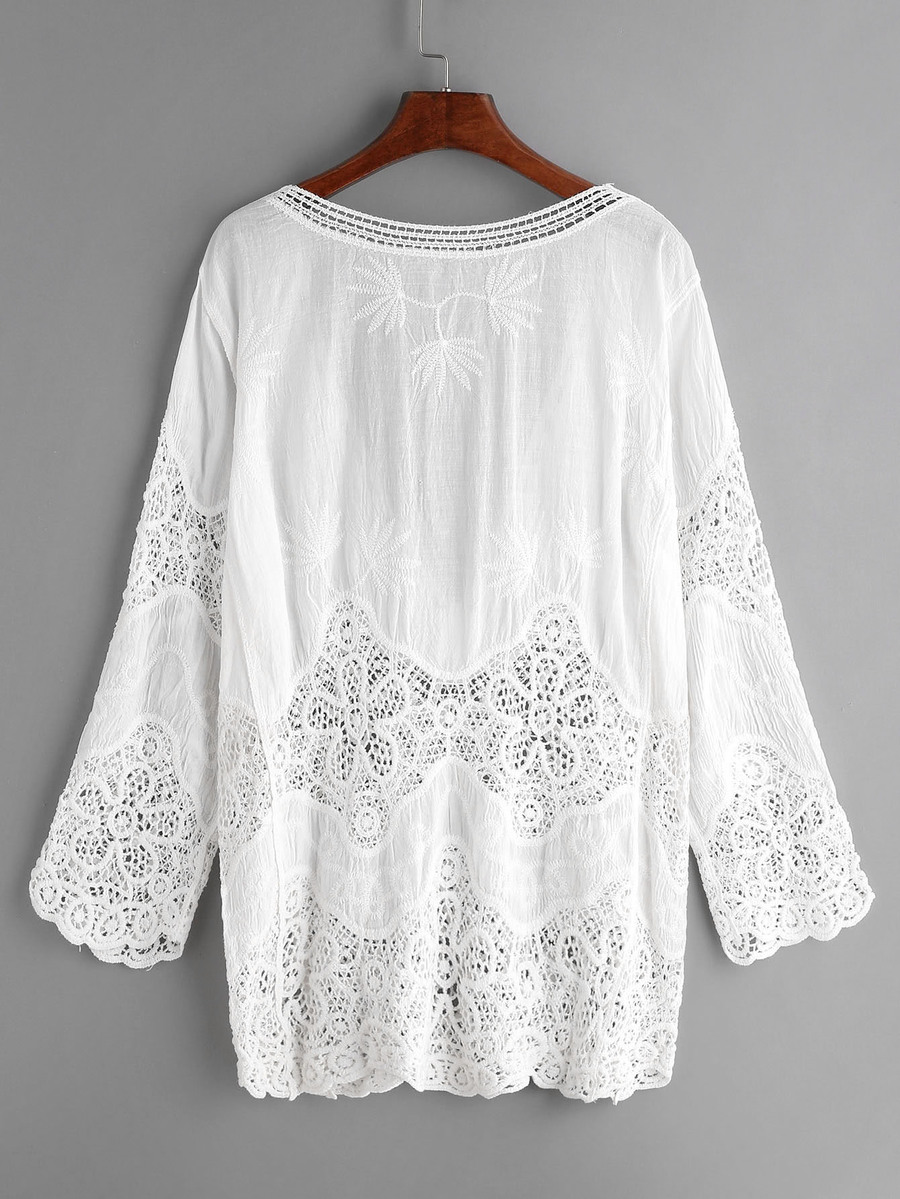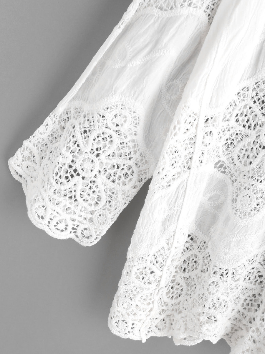 White V Neck Embroidered Eyelet Crochet Lace Blouse
