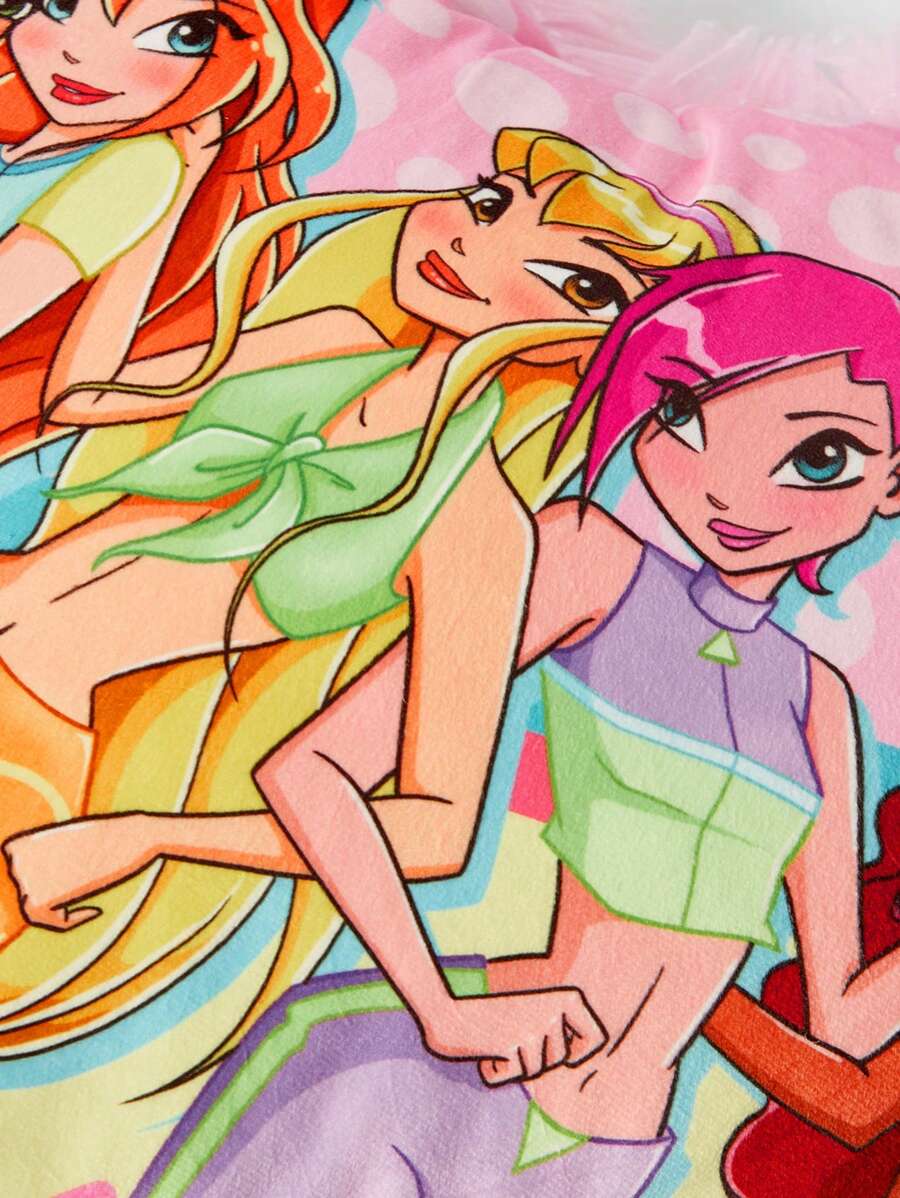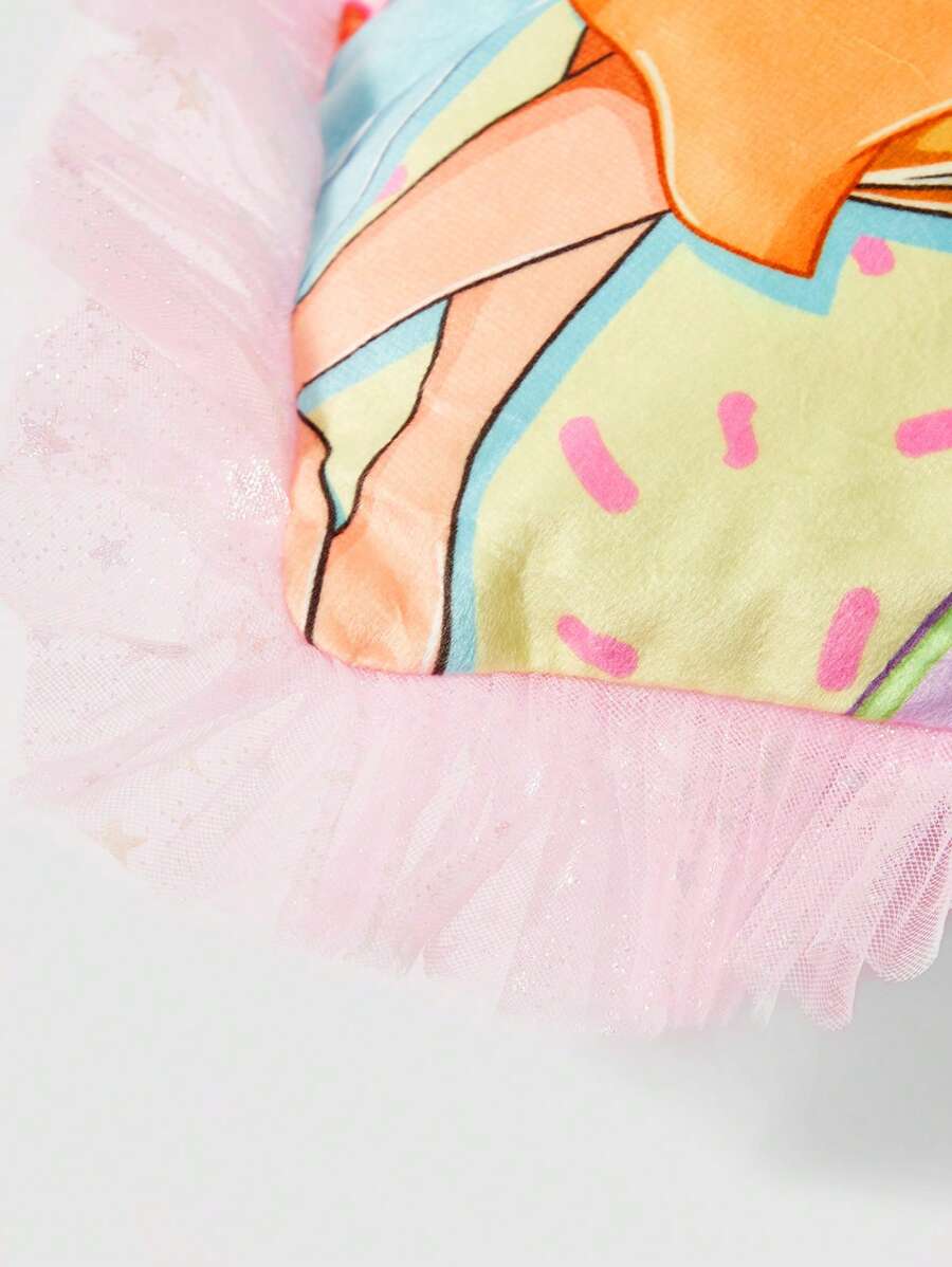 Winx Club X ROMWE 1pc Lace Edged Cushion Cover With Six Fairy Girl Graphic On Pink Background, Suitable For Living Room And Bedroom