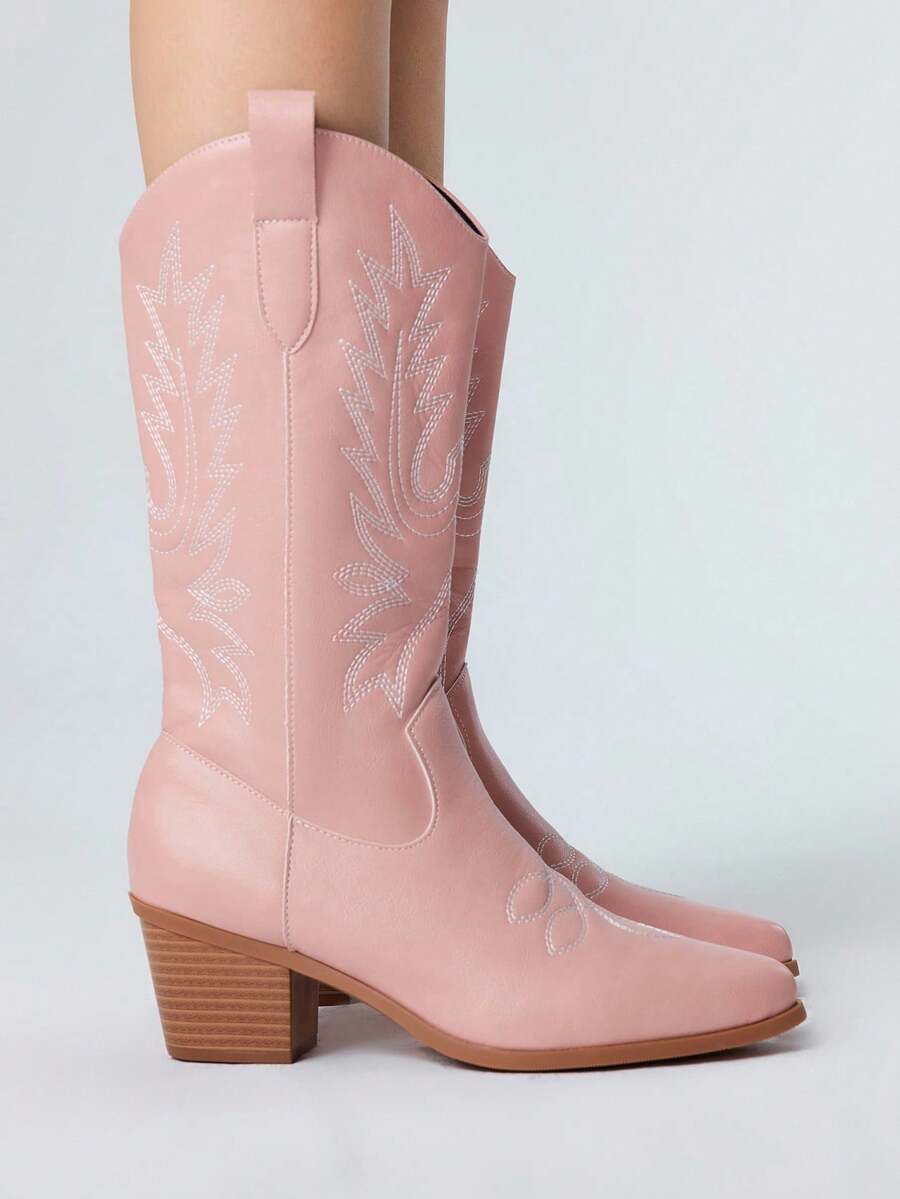 Fairycore Women's 2025 Spring/Autumn New Embroidered Pointed Toe Slip-On Chunky Heel Western Cowboy Boots, Pink