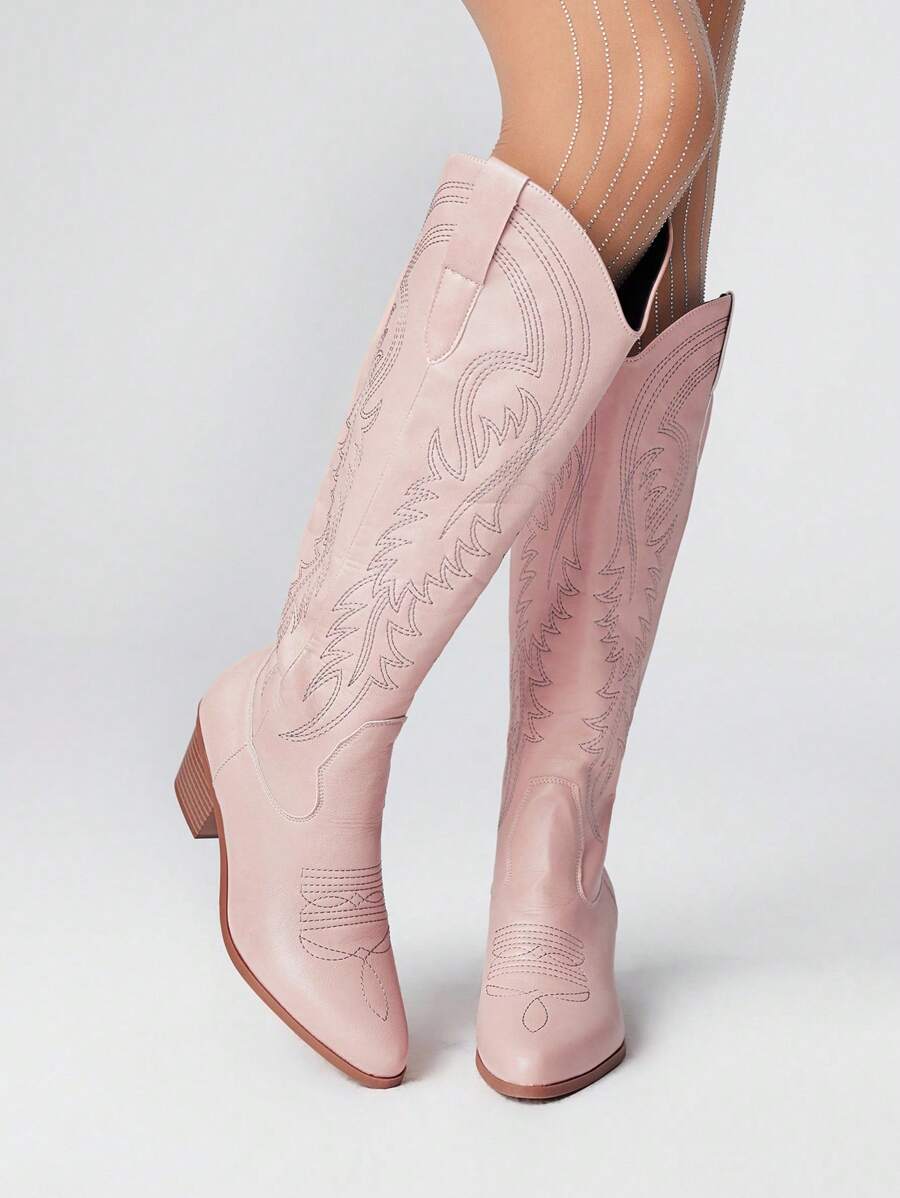 Fairycore Women's 2025 Spring/Autumn New Kawaii Pink Embroidered Western Boots, Leather Outdoor Fashion Slip-On Mid-Calf Boots