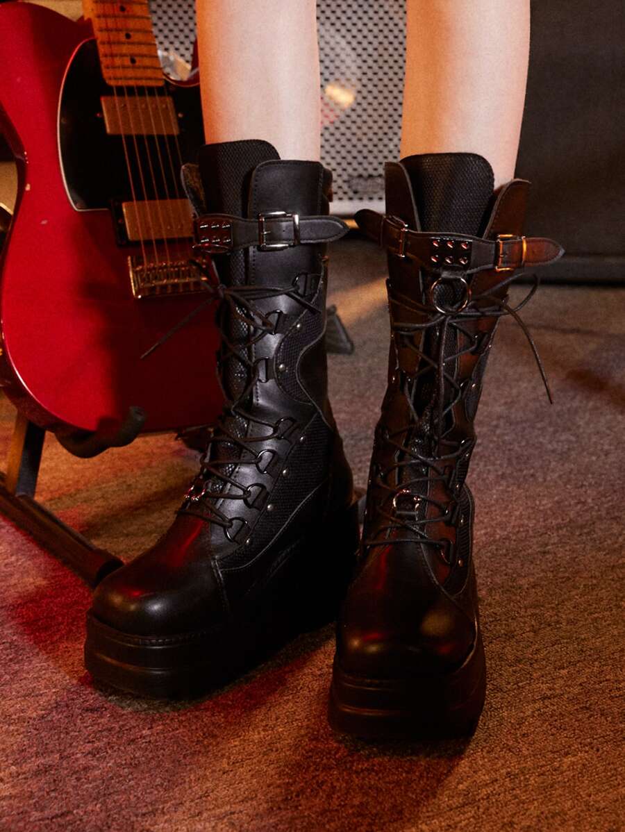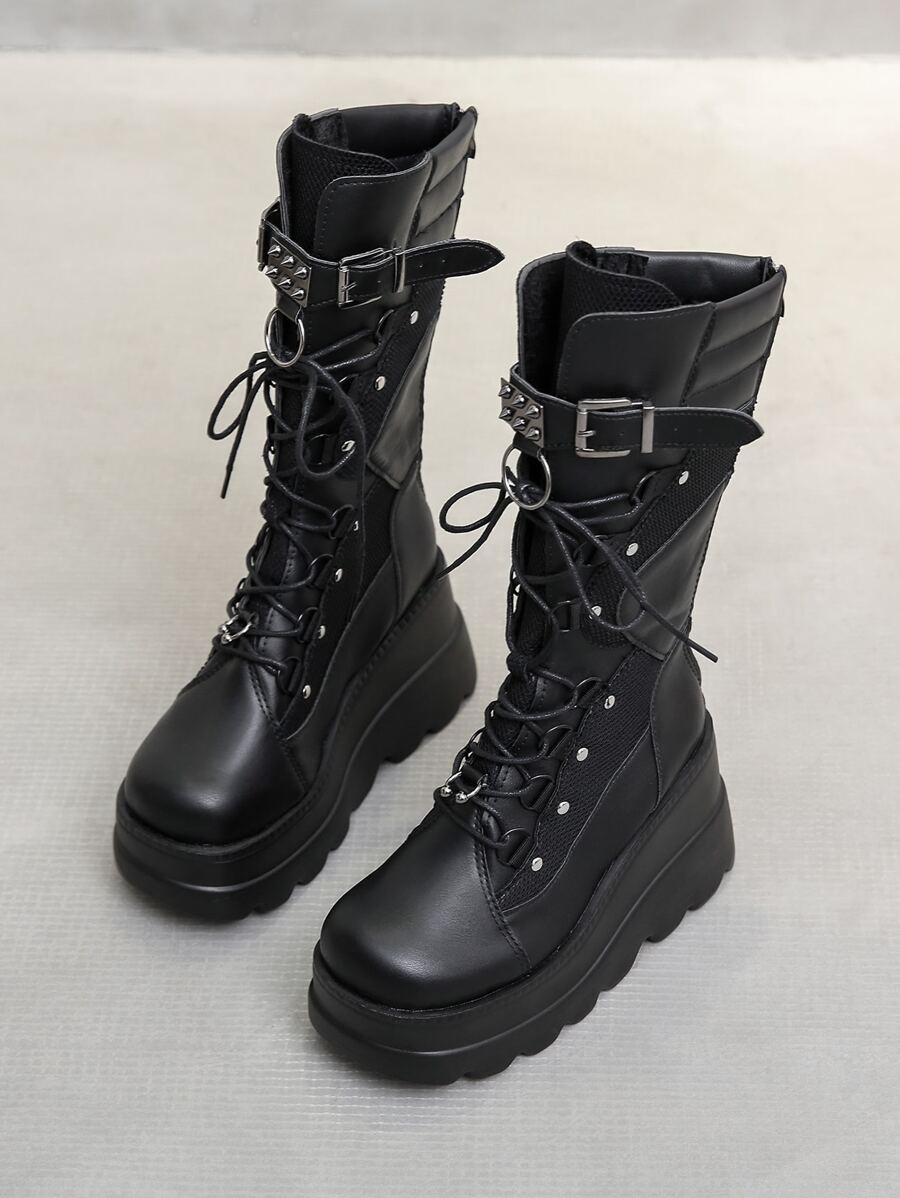 Grunge Punk Women's Black Punk Buckled Solid Color Boots With Buckled Decorations And Front Lace-Up Fall For Christmas And New Year Holiday Valentines Spring Shoes