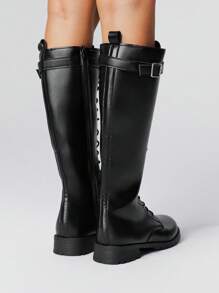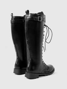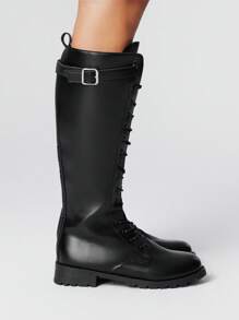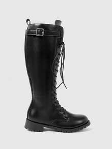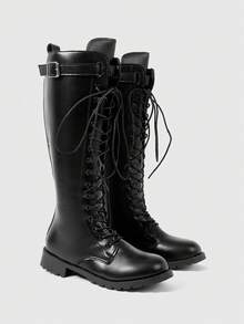 Grunge Punk Women's Black Punk Rock Gothic Platform Buckle Strap Thick Sole Motorcycle Knee-High Boots, Leather Tall Boots For Parties & All-Season Wear, Halloween