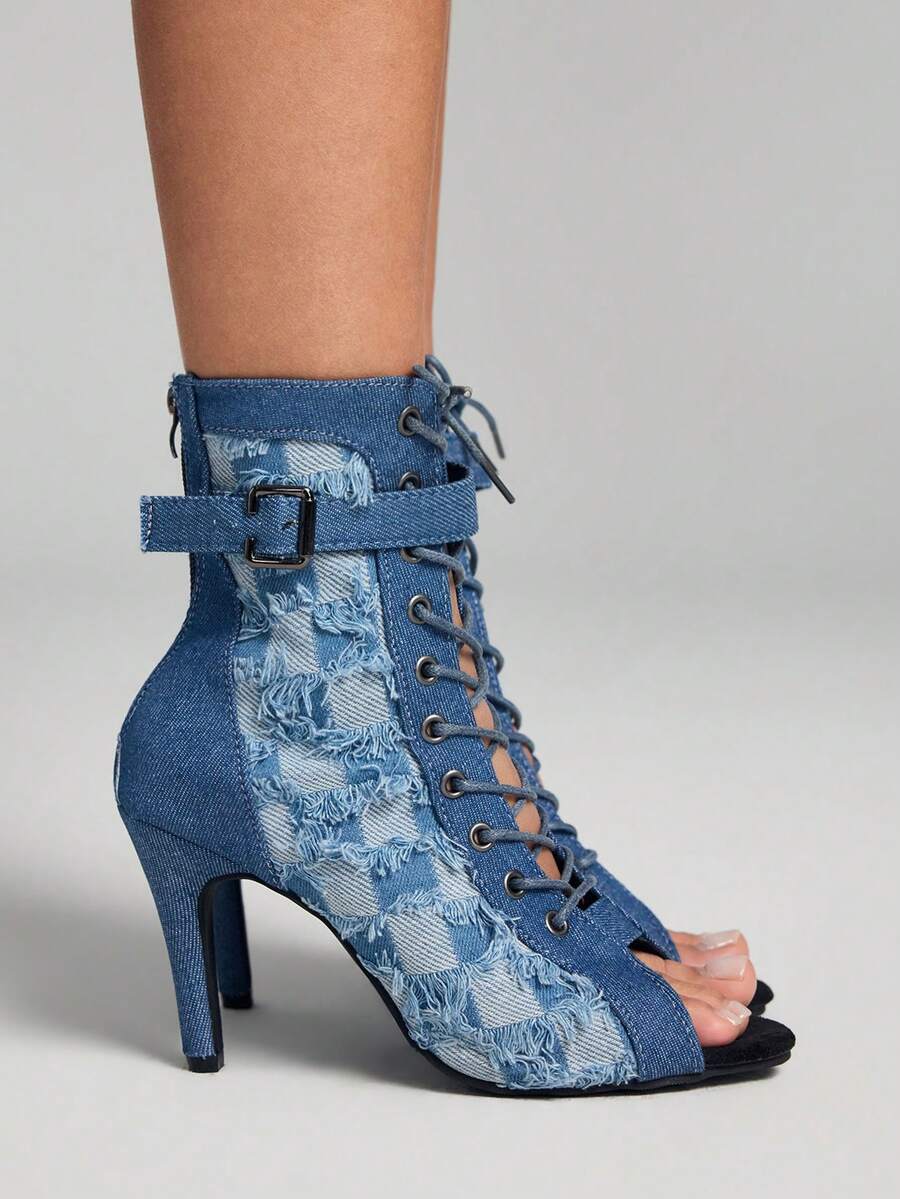 Grunge Punk Women's Blue Open Toe High Heel Boots, Casual British Style Dance Boots With Rubber Soft Outsole, Lace-Up Design, Rear Zipper Closure, Elegant Summer Outdoor High Heel Sandals, Gothic Sexy Crackle Texture, Suitable For Party, Outdoor, Gym, Holiday, All Season