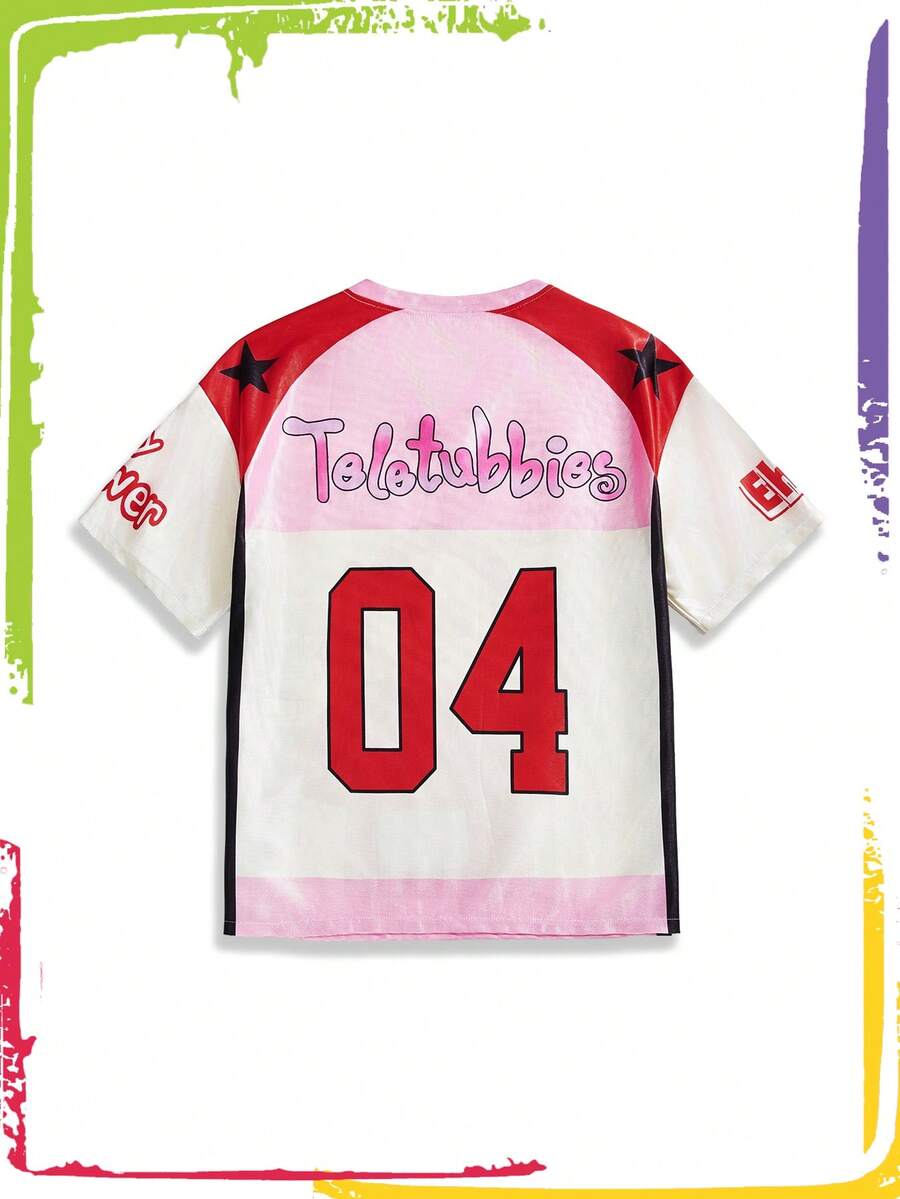 Teletubbies X ROMWE Women's Casual Colorblock Cartoon & Letter Graphic V-Neck Short Sleeve T-Shirt, Summer