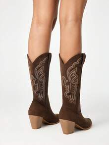 Fairycore Women's Cowboy Boots, Khaki Outdoor Casual Fashion Slip-On Embroidered Faux Suede Western Boots, Mid-Calf, Spring/Autumn