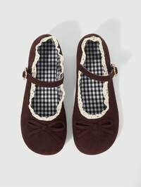 Kawaii Women's Brown Loafers, Closed Toe Mary Jane Shoes, Bow Lace Lolita Flats, Ballet Flats