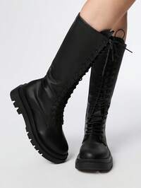 Women's Round Toe Punk Lace-Up Side Zipper Platform Thick Sole Boots With Fur Lining, Outdoor Fashion Over-The-Knee Boots, Autumn/Winter New Arrival