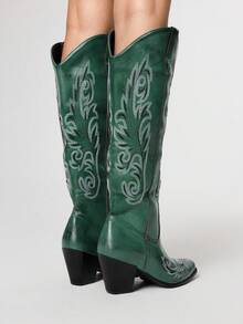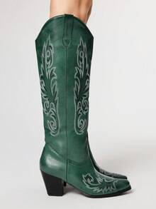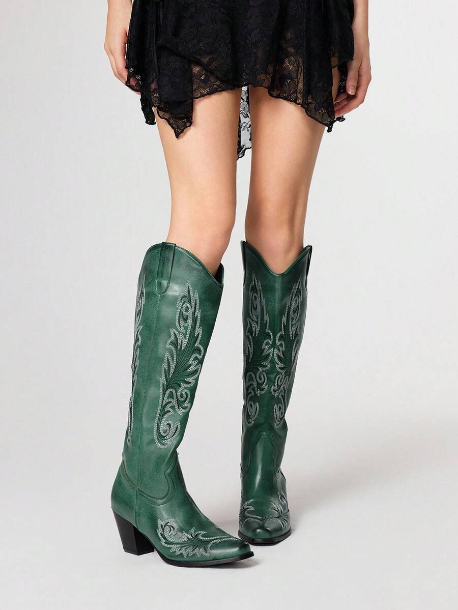 Fairycore Women's Cowgirl Boots, Slip-On, Asymmetrical Distressed Details, Embroidery, Western Style Boots, Outdoor Fashion Knee-High Boots