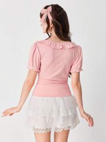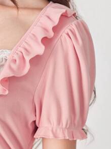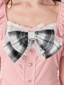 EDITION Women's Cute Collegiate Style 2 In 1 Lace Patchwork Plaid Bow Decor Bodycon T-Shirt