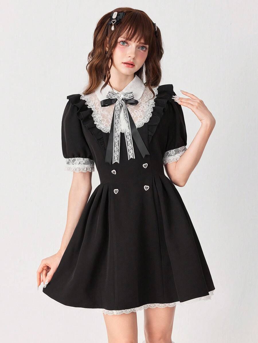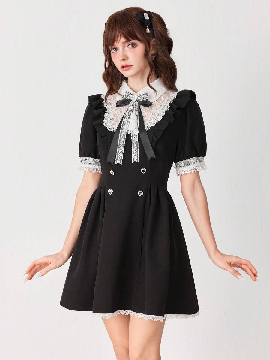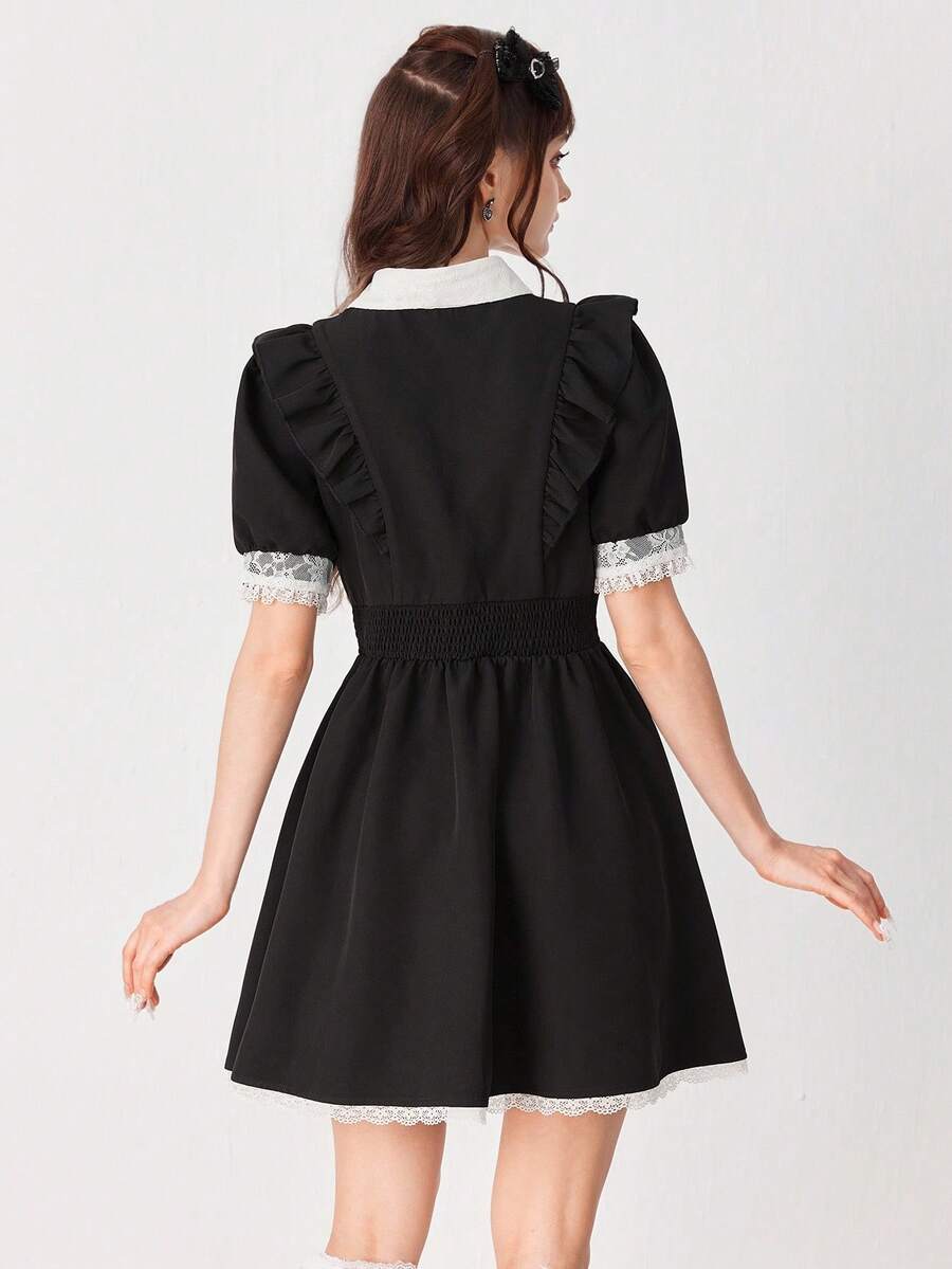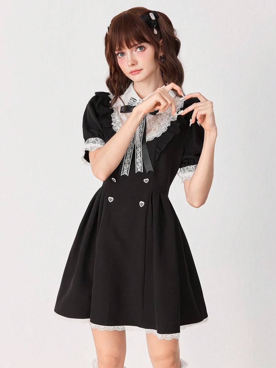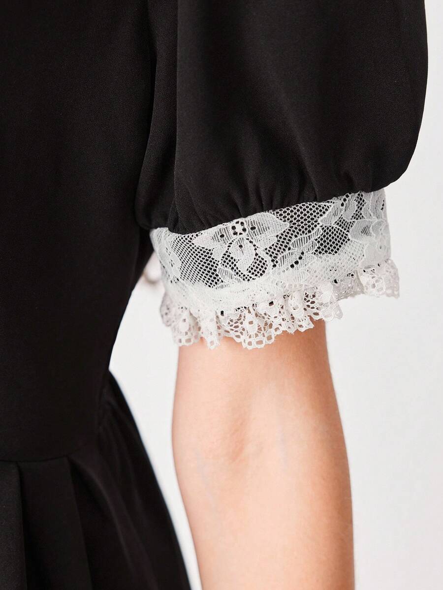 EDITION Women's Cute Princess College Style Contrast Color Lace Patchwork Peter Pan Collar Delicate Accessory Decor Puff Sleeve Pleated Dress