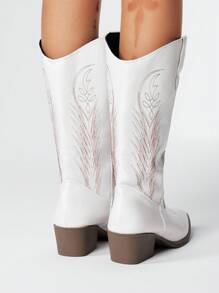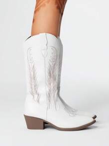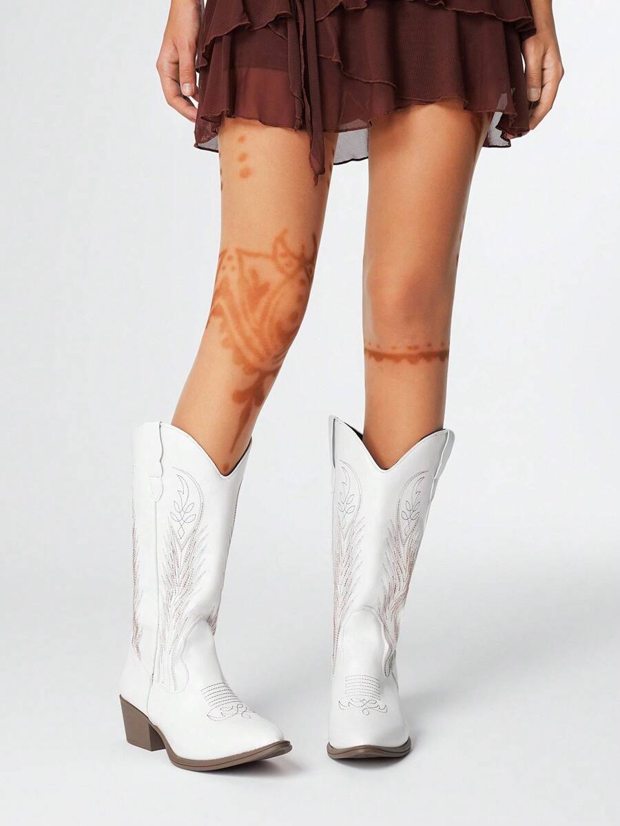 Fairycore Women's Fall White Pointed Toe Low Heel Western Boots, Slip-On Riding Tall Boots, College Style Knee-High Boots, Embroidered V-Cut Slip-On Leather Boots, Mid-Calf Boots