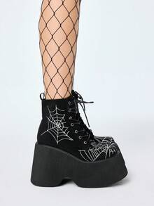 Goth Women's Fashion Thick Sole Super High Heel Ankle Boots, Punk Y2K Spider Web Embroidery Lace-Up Platform Boots, Suitable For Stage Performance Wedge Boots