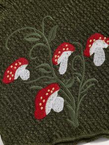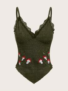 Fairycore Women's Lace Trim V Neck Dark Green Mushroom Pattern Top