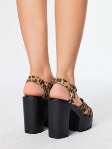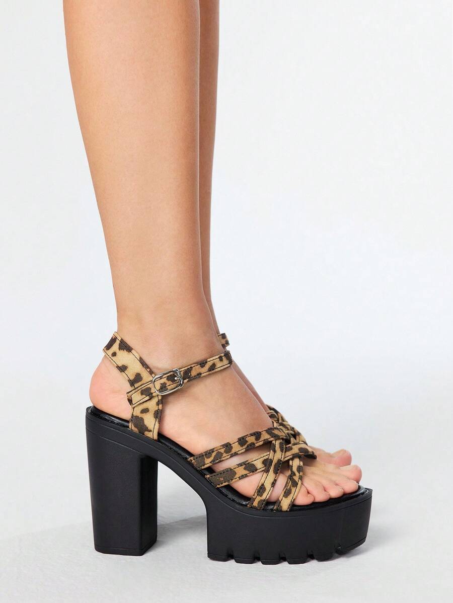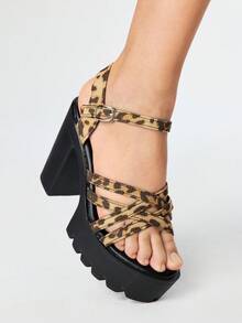 Grunge Punk Women's Leopard Print High Heel Sandals, Summer Open Toe Chunky Heel Strap Formal Work Crossover Strappy Dress Heels