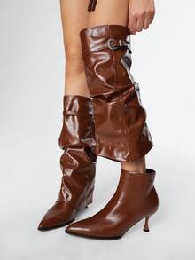 Fairycore Women's Pointed Toe Buckle Design Pleated Fashion High Heel Knee-High Boots (Skinny Leg Boots)