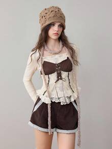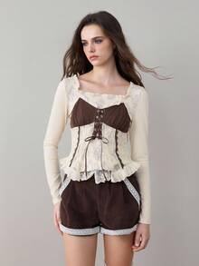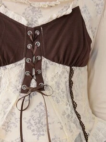 ROMWE Avant Women's Retro Cottagecore Style 2 In 1 Lace Patchwork Bowknot U-Neck T-Shirt